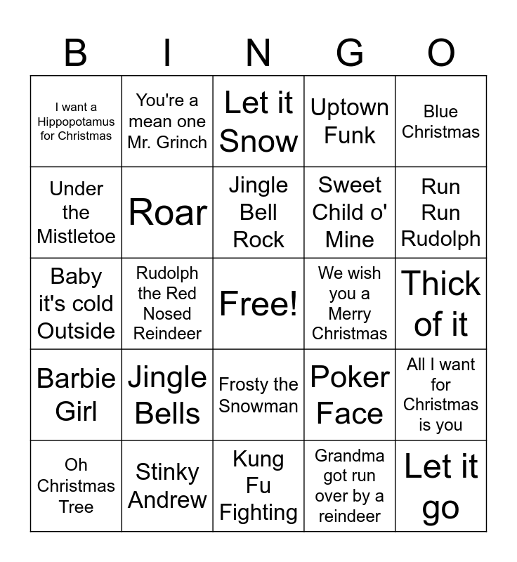 This bingo card has a free space and 42 words: Last Christmas, Jingle Bell Rock, Rocking Around the Christmas Tree, Jingle Bells, Grandma got run over by a reindeer, All I want for Christmas is you, Let it go, YMCA, Let it Snow, Frosty the Snowman, Thick of it, Run Run Rudolph, Rudolph the Red Nosed Reindeer, Blue Christmas, California Girls, Poker Face, Macarena, Baby it's cold Outside, Deck the Halls, You're a mean one Mr. Grinch, Under the Mistletoe, Where are you Christmas?, It's the most Wonderful time of the year, I want a Hippopotamus for Christmas, I saw Mommy Kissing Santa Claus, What's this?, Sweet Child o' Mine, All Star, Party in the USA, ABC, We don't talk about Bruno, Barbie Girl, Roar, Kung Fu Fighting, Everybody Dance now, Oh Christmas Tree, Stinky Andrew, We wish you a Merry Christmas, Chicken Man Rap, Goofy Goober, Uptown Funk and Bye Bye Bye.