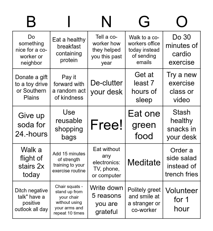This bingo card has a free space and 24 words: Add 15 minutes of strength training to your exercise routine, Chair squats - stand up from your chair without using your arms and repeat 10 times, De-clutter your desk, Ditch negative talk" have a positive outlook all day, Do 30 minutes of cardio exercise, Do something nice for a co-worker or neighbor, Donate a gift to a toy drive or Southern Plains, Eat a healthy breakfast containing protein, Eat one green food, Eat without any electronics: TV, phone, or computer, Get at least 7 hours of sleep, Give up soda for 24.-hours, Meditate, Order a side salad instead of trench fries, Pay it forward with a random act of kindness, Politely greet and smile at a stranger or co-worker, Stash healthy snacks in your desk, Tell a co-worker how they helped you this past year, Try a new exercise class or video, Use reusable shopping bags, Volunteer for 1 hour, Walk a flight of stairs 2x today, Walk to a co-workers office today instead of sending emails and Write down 5 reasons you are grateful.