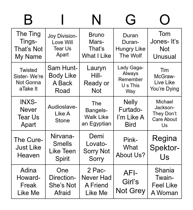 This bingo card has 26 words: Demi Lovato- Sorry Not Sorry, AFI- Girl’s Not Grey, Lauryn Hill- Ready or Not, One Direction- She’s Not Afraid, Tom Jones- It’s Not Unusual, The Ting Tings- That’s Not My Name, Twisted Sister- We’re Not Gonna aTake It, Joy Division- Love Will Tear Us Apart, Michael Jackson- They Don’t Care About Us, Pink- What About Us?, Lady Gaga- Always Remember U s This Way, INXS- Never Tear Us Apart, Regina Spektor- Us, Adina Howard- Freak Like Me, Audioslave- Like A Stone, Cardi B- I Like It, Duran Duran- Hungry Like The Wolf, The Cure- Just Like Heaven, Bruno Mars- That’s What I Like, The Bangels- Walk Like an Egyptian, Tim McGraw- Live Like You’re Dying, 2 Pac- Never Had A Friend Like Me, Nelly Furtado- I’m Like A Bird, Nirvana- Smells Like Teen Spirit, Sam Hunt- Body Like A Back Road and Shania Twain- Feel Like A Woman.
