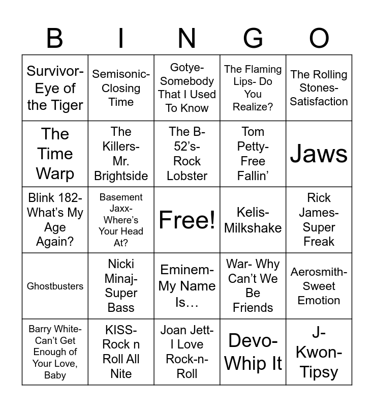 This bingo card has a free space and 26 words: Eminem- My Name Is…, Devo- Whip It, The B-52’s- Rock Lobster, KISS- Rock n Roll All Nite, The Rolling Stones- Satisfaction, Survivor- Eye of the Tiger, The Time Warp, Semisonic- Closing Time, Rick James- Super Freak, War- Why Can’t We Be Friends, Tom Petty- Free Fallin’, Blink 182- What’s My Age Again?, Aerosmith- Sweet Emotion, Barry White- Can’t Get Enough of Your Love, Baby, Basement Jaxx- Where’s Your Head At?, Beastie Boys- Paul Revere, The Flaming Lips- Do You Realize?, Ghostbusters, Gotye- Somebody That I Used To Know, J-Kwon- Tipsy, Jaws, Joan Jett- I Love Rock-n-Roll, Kelis- Milkshake, Nicki Minaj- Super Bass, The Killers- Mr. Brightside and Lil Nas X- Old Town Road.
