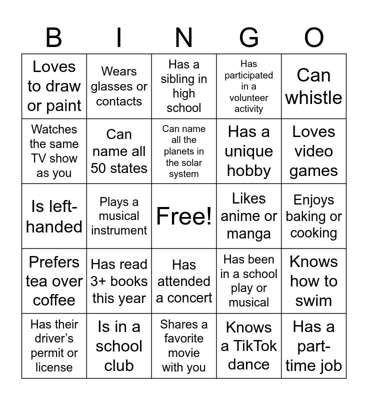 This bingo card has a free space and 30 words: Is in a school club, Has traveled out of state, Plays a musical instrument, Is on a sports team, Loves to draw or paint, Has a sibling in high school, Can name all 50 states, Has attended a concert, Likes anime or manga, Shares a favorite movie with you, Enjoys baking or cooking, Has a part-time job, Knows a TikTok dance, Is learning a new language, Loves video games, Loves math or science, Has been in a school play or musical, Prefers tea over coffee, Has read 3+ books this year, Can whistle, Is left-handed, Is an only child, Wears glasses or contacts, Has a unique hobby, Watches the same TV show as you, Has participated in a volunteer activity, Knows how to swim, Has their driver’s permit or license, Can name all the planets in the solar system and Prefers listening to podcasts over music.