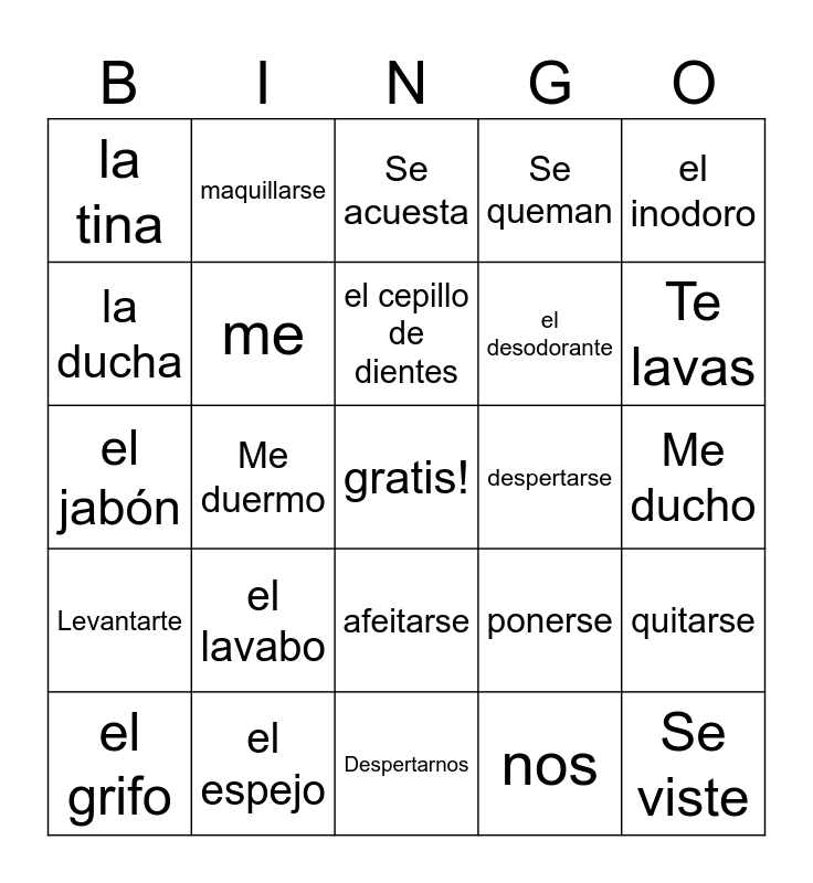 This bingo card has a free space and 24 words: el lavabo, el espejo, el cepillo de dientes, el grifo, el inodoro, la tina, la ducha, maquillarse, despertarse, afeitarse, el desodorante, el jabón, ponerse, quitarse, me, nos, Me ducho, Se acuesta, Te lavas, Me duermo, Se viste, Levantarte, Se queman and Despertarnos.