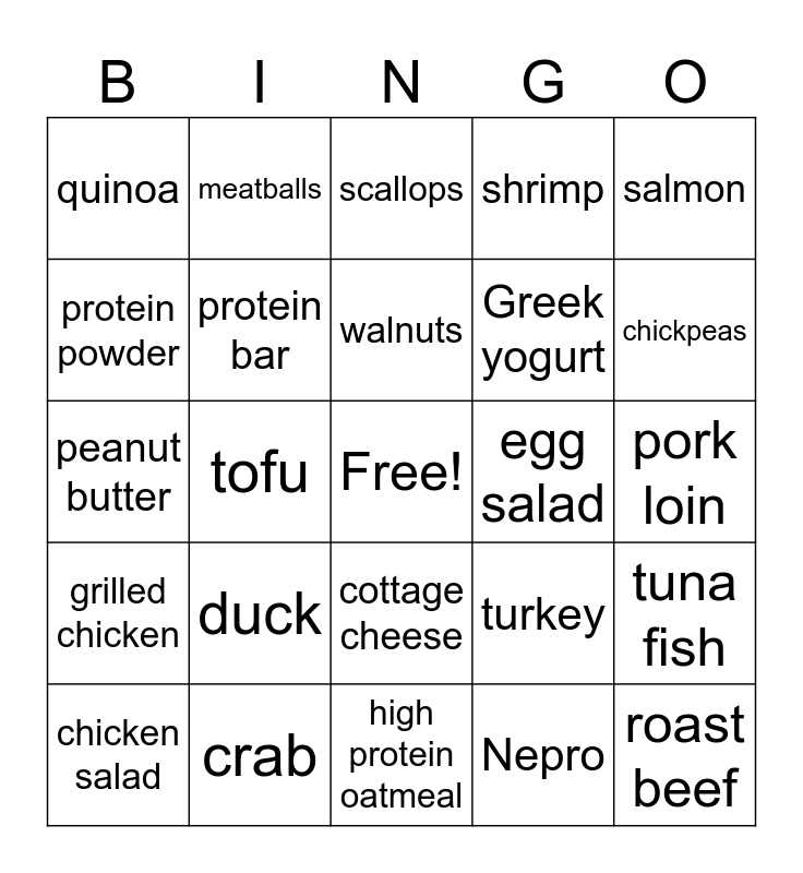 This bingo card has a free space and 24 words: duck, crab, walnuts, chicken salad, salmon, quinoa, protein powder, meatballs, egg salad, cottage cheese, Greek yogurt, peanut butter, turkey, tuna fish, protein bar, Nepro, pork loin, scallops, chickpeas, tofu, roast beef, grilled chicken, shrimp and high protein oatmeal.