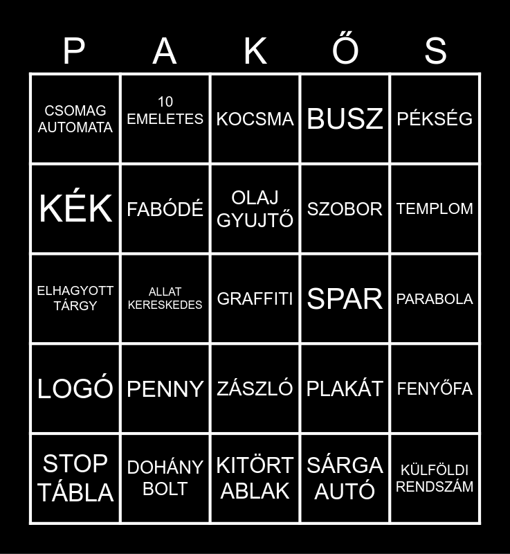 This bingo card has a free space and 44 words: LADA, KÜLFÖLDI RENDSZÁM, DUNA, STOP TÁBLA, LYUK, SÁRGA AUTÓ, KOCSMA, ÜRES ÜZLET, PÉKSÉG, DOHÁNY BOLT, BUSZ, SPAR, ZÁSZLÓ, PENNY, JÁTSZÓTÉR, KITÖRT ABLAK, NÁDOR UTCA, ELHAGYOTT TÁRGY, BICIKLI, TEMPLOM, 10 EMELETES, VONAT, ZEBRA, CSOMAG AUTOMATA, SZOKNYA, PARABOLA, BOCSKAI UTCA, TAXI, PLAKÁT, LOGÓ, COOP, FENYŐFA, KÍNAI, LOTTO, ALLAT KERESKEDES, MERCEDES, TESLA, TEHERAUTO, OLAJ GYUJTŐ, KÉK, SZOBOR, POSTALÁDA, FABÓDÉ and MACSKA.