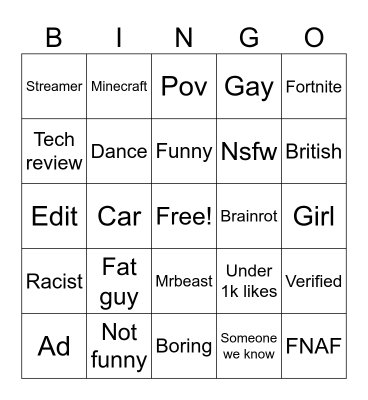 This bingo card has a free space and 24 words: Fat guy, Not funny, Funny, Ad, Fortnite, Streamer, Tech review, Minecraft, Brainrot, Mrbeast, Nsfw, Edit, Under 1k likes, Verified, Dance, Someone we know, Girl, Pov, British, Car, FNAF, Racist, Gay and Boring.