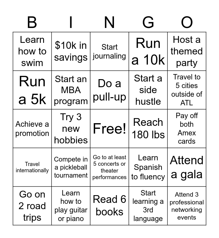 This bingo card has a free space and 24 words: Compete in a pickleball tournament, Learn how to play guitar or piano, Do a pull-up, Go on 2 road trips, Host a themed party, Learn how to swim, Run a 5k, $10k in savings, Reach 180 lbs, Go to at least 5 concerts or theater performances, Start a side hustle, Achieve a promotion, Learn Spanish to fluency, Attend a gala, Start an MBA program, Start learning a 3rd language, Pay off both Amex cards, Start journaling, Travel to 5 cities outside of ATL, Try 3 new hobbies, Attend 3 professional networking events, Travel internationally, Run a 10k and Read 6 books.