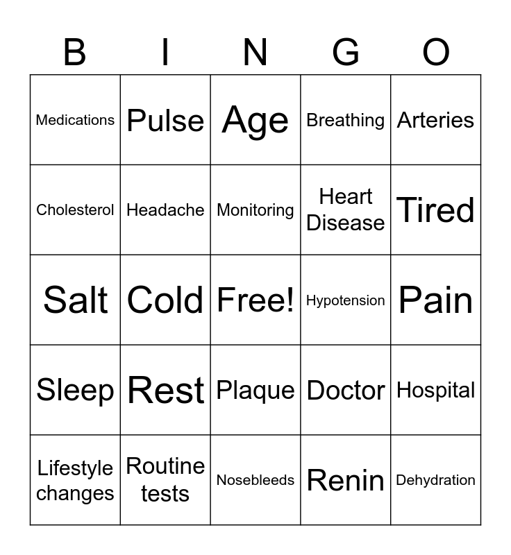 This bingo card has a free space and 24 words: Rest, Routine tests, Monitoring, Lifestyle changes, Arteries, Medications, Cholesterol, Pulse, Hypotension, Plaque, Heart Disease, Salt, Doctor, Hospital, Headache, Renin, Pain, Age, Tired, Cold, Dehydration, Sleep, Breathing and Nosebleeds.