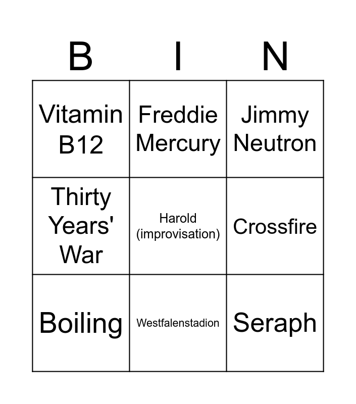 This bingo card has a free space and 8 words: Crossfire, Jimmy Neutron, Freddie Mercury, Boiling, Vitamin B12, Seraph, Thirty Years' War and Westfalenstadion.