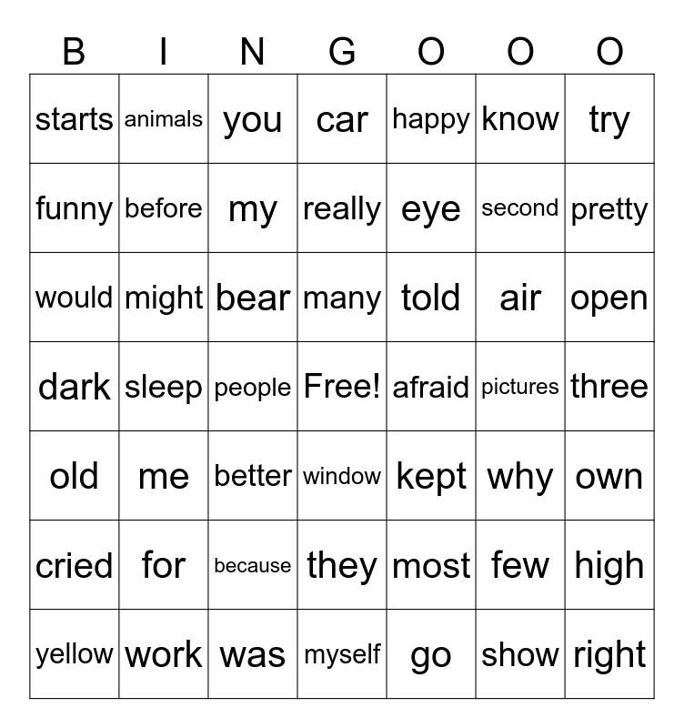 This bingo card has a free space and 48 words: most, second, myself, sleep, bear, three, animals, work, know, window, try, car, air, told, cried, pictures, funny, pretty, few, happy, eye, people, starts, before, high, my, open, yellow, many, might, show, afraid, own, for, dark, kept, why, would, better, because, old, right, you, was, really, they, me and go.