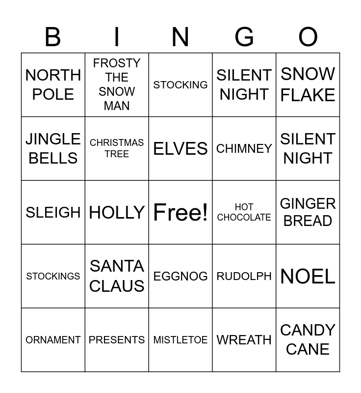 This bingo card has a free space and 24 words: SANTA CLAUS, PRESENTS, ELVES, ORNAMENT, SNOW FLAKE, NORTH POLE, JINGLE BELLS, FROSTY THE SNOW MAN, HOT CHOCOLATE, EGGNOG, CHIMNEY, SLEIGH, RUDOLPH, NOEL, CHRISTMAS TREE, WREATH, GINGER BREAD, STOCKING, SILENT NIGHT, HOLLY, CANDY CANE, STOCKINGS, SILENT NIGHT and MISTLETOE.
