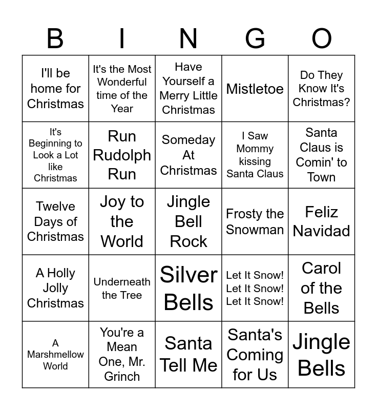 This bingo card has 52 words: Free!, Jingle Bell Rock, Last Christmas, Santa Tell Me, Underneath the Tree, Winter Wonderland, It's the Most Wonderful time of the Year, Holly Jolly Christmas, It's Beginning to Look a Lot like Christmas, Snowman, Run Rudolph Run, Sleigh Ride, Carol of the Bells, Let It Snow! Let It Snow! Let It Snow!, This Christmas, Merry Christmas, Please Don't Call, Someday At Christmas, Frosty the Snowman, Here Comes Santa Claus, Do They Know It's Christmas?, Joy to the World, Santa's Coming for Us, I'll be home for Christmas, I Saw Mommy kissing Santa Claus, I Wish It Could be Christmas Everyday, Jingle Bells, Do you hear what I hear?, Christmas Tree Farm, Santa Claus is Comin' to Town, Blue Christmas, Rudolph the Red-Nosed Reindeer, Mistletoe, Santa Baby, Please Come Home for Christmas, Mele Kalikimaka, Have Yourself a Merry Little Christmas, You're a Mean One, Mr. Grinch, Let It Go, Candy Cane Lane, Do You Want to Build a Snowman?, Grandma Got Ran Over by a Reindeer, Feliz Navidad, A Holly Jolly Christmas, I Want a Hippopotamus for Christmas, Silver Bells, Deck the Halls, All I Want for Christmas, Twelve Days of Christmas, Puppies are Forever, Dominick the Donkey, A Marshmellow World and Christmas Time is Here.