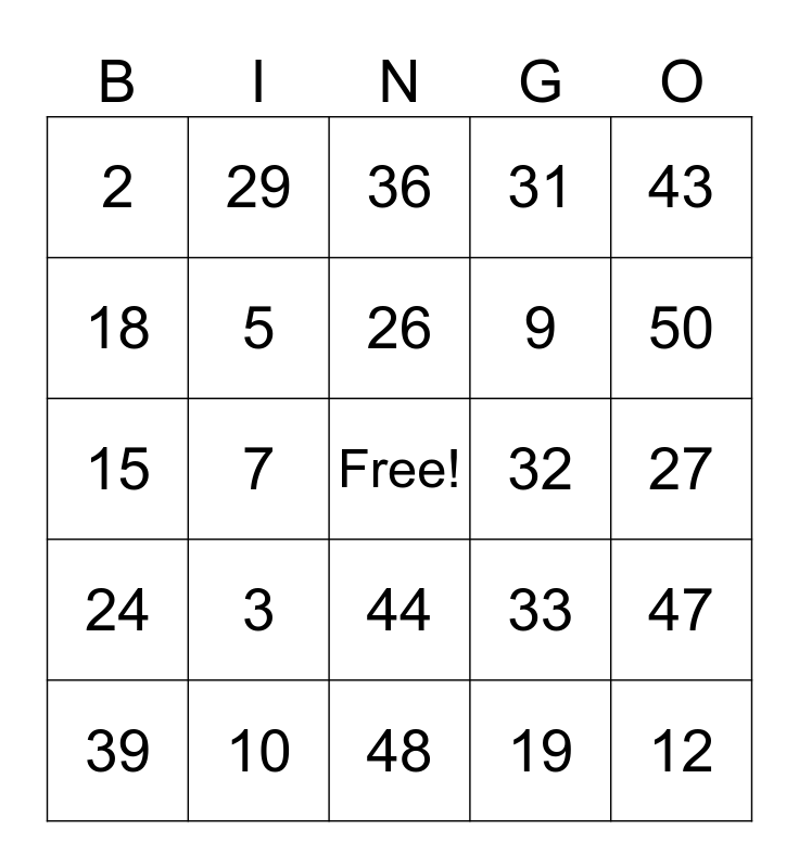 This bingo card has a free space and 24 words: 3, 10, 26, 39, 43, 2, 18, 29, 32, 44, 9, 15, 33, 47, 5, 19, 27, 36, 50, 7, 12, 24, 31 and 48.