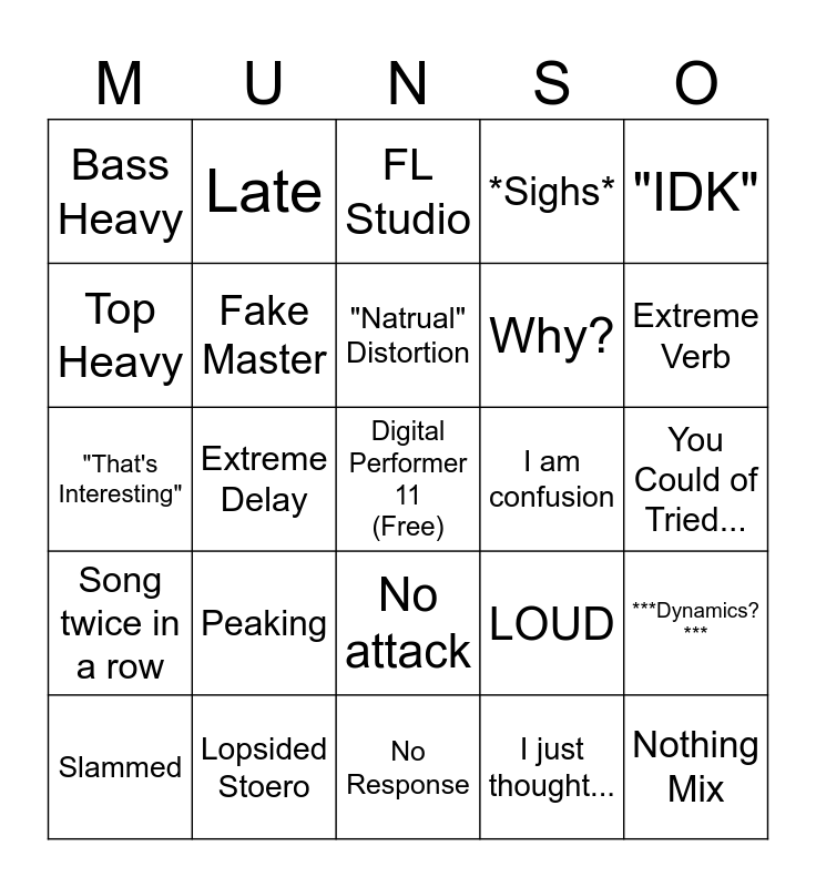 This bingo card has a free space and 24 words: Peaking, Lopsided Stoero, "Natrual" Distortion, Slammed, "IDK", Bass Heavy, Top Heavy, Late, I am confusion, No attack, Why?, "That's Interesting", LOUD, ***Dynamics?***, Fake Master, I just thought..., You Could of Tried..., FL Studio, Extreme Verb, Extreme Delay, Nothing Mix, Song twice in a row, *Sighs* and No Response.