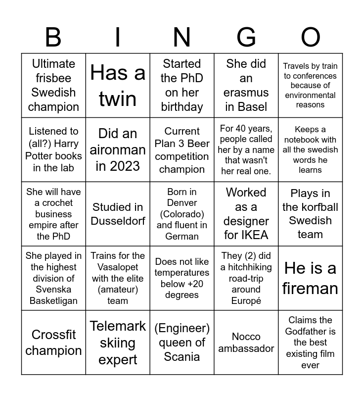 This bingo card has 74 words: Free!, Her ski debut was in Canada, Started the PhD on her birthday, Big fan of Hammarby, Prepares the strongest Glög i Sverige, Loves the helado de fresa!, Plays piano and guitar, Has a bottle of ouzo in the office, Crossfit champion, Used to work at Yasuragi, Never missed a taco Friday since 1995, Considers herself a friend of Foppa, Current Plan 3 Beer competition champion, Listened to (all?) Harry Potter books in the lab, Google maps favourite biker, Studied in Dusseldorf, Claims the Godfather is the best existing film ever, Keeps a notebook with all the swedish words he learns, She prepares the best Thanks giving Tofu, She will have a crochet business empire after the PhD, Did an aironman in 2023, Has a twin, She did an erasmus in Basel, Loves miniatures, Born in Denver (Colorado) and fluent in German, He loves the mountains and the raves, She does natural wine, They (2) have recently been to a conference in Japan., She was part of the Västgöta nation in Uppsala, She published a thesis and a novel, Travels by train to conferences because of environmental reasons, Worked for many years in a Science fiction book shop, He provided a 4-week supply of popcorn to plan 3, He was a teacher assistant in Cold spring habor (US), Mango-beer brewer, Nocco ambassador, Engineered around 200 E.coli strains in less than a week, She is a urban planner in Stockholm, Community manager of Elmer (on adventures), Plays the trombon in the KTH orchestra, (Engineer) queen of Scania, Telemark skiing expert, Spend one month in SF and moved 4 times, Owns a dog named Scipio, Studies sport psycology in her PhD, Ultimate frisbee Swedish champion, Lived in 4 different countries in the last 3 months, Trains for the Vasalopet with the elite (amateur) team, She ran the half-marathon in Stockholm, Wrote a book about the second world war, Just came back from South Korea, He went downhill Riksgräansen at full speed and 1 cm visibility, Plays in the korfball Swedish team, She is a lawyer!, She is a real doctor, Designer of Anna's thesis cover, Does not like temperatures below +20 degrees, Just came back from Argentina, Owns a home-truck, He is a fireman, For 40 years, people called her by a name that wasn't her real one., He was a professional bandy player, She played in the highest division of Svenska Basketligan, He is a professional basketball referee, Worked as a designer for IKEA, He has a strong connection with the city of Jho, She skiis in the alps every single winter weekend, Visited Sweden and loved Surströmming, They (2) did a hitchhiking road-trip around Europé, Dislikes BL21 (DE3) as an expression system, They married in the most beautiful spot of Costa Brava, Purified half a kilogram of antibodies, They (2) LOVE spindelmannen and He has a dog but does not own it.