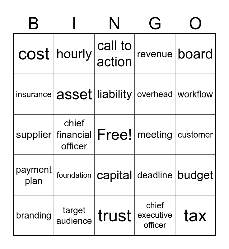 This bingo card has a free space and 51 words: business, tax, monopoly, trust, foundation, salary, hourly, gross income, insurance, marketing, asset, revenue, budget, deadline, competition, investment, liability, meeting, agenda, board, chief financial officer, chief executive officer, cost, overhead, invoice, estimate, workflow, action plan, branding, call to action, case study, clickbait, landing page, return on investment, search engine optimization, target audience, testimonial, bulk, client, buyer, customer, payment plan, pay in full, pay upfront, quote, refund, supplier, wholesaler, manufacturer, capital and cash flow.