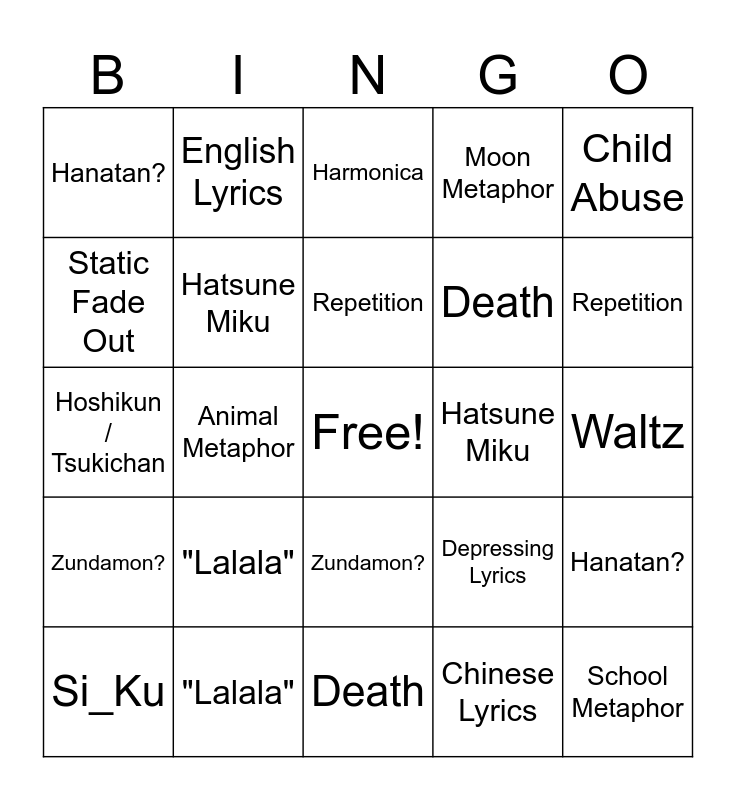 This bingo card has a free space and 38 words: Eclectic samples, Harmonica, Qixuan, Hatsune Miku, Hanatan?, "Lalala", Repetition, Si_Ku, Child Abuse, Death, Animal Metaphor, Moon Metaphor, School Metaphor, Waltz, Static Fade Out, Zundamon?, Eclectic samples, Harmonica, Qixuan, Hatsune Miku, Hanatan?, "Lalala", Repetition, Si_Ku, Child Abuse, Death, Cats, Animal Metaphor, Moon Metaphor, Waltz, Static Fade Out, Zundamon?, Chinese Lyrics, English Lyrics, Actually Wholesome, Depressing Lyrics, Hoshikun / Tsukichan and Chota Akatsuki.