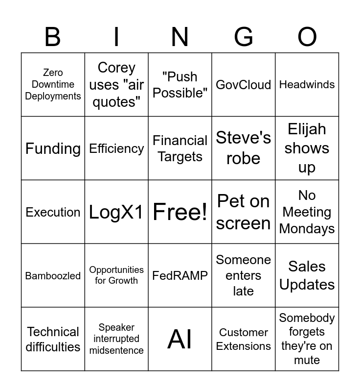 This bingo card has a free space and 35 words: Active, Wade/Wyatt, Margins, Efficiency, FedRAMP, GovCloud, Funding, Allusion to DeCA Cancelling Contract, Financial Targets, Headcount, Execution, Headwinds, Macro Environment, Vocollect FIPS, Zero Downtime Deployments, Pet on screen, Customer Extensions, LogX1, Bamboozled, Somebody forgets they're on mute, Someone enters late, Technical difficulties, Sales Updates, Speaker interrupted midsentence, "Push Possible", Elijah shows up, Focus on the Customer, RM Program Discussion, Steve's robe, No Meeting Mondays, Innovation, AI, Opportunities for Growth, Corey uses "air quotes" and "The Matts".