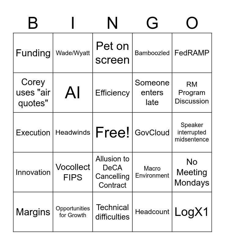 This bingo card has a free space and 35 words: "Push Possible", "The Matts", Active, AI, Allusion to DeCA Cancelling Contract, Bamboozled, Corey uses "air quotes", Customer Extensions, Efficiency, Elijah shows up, Execution, FedRAMP, Financial Targets, Focus on the Customer, Funding, GovCloud, Headcount, Headwinds, Innovation, LogX1, Macro Environment, Margins, No Meeting Mondays, Opportunities for Growth, Pet on screen, RM Program Discussion, Sales Updates, Somebody forgets they're on mute, Someone enters late, Speaker interrupted midsentence, Steve's robe, Technical difficulties, Vocollect FIPS, Wade/Wyatt and Zero Downtime Deployments.