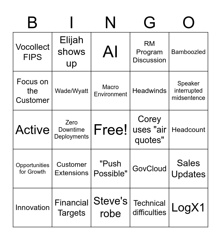 This bingo card has a free space and 35 words: Allusion to DeCA Cancelling Contract, Pet on screen, "The Matts", Wade/Wyatt, "Push Possible", RM Program Discussion, Focus on the Customer, Margins, Macro Environment, No Meeting Mondays, Active, Bamboozled, Execution, Someone enters late, Vocollect FIPS, Corey uses "air quotes", Technical difficulties, Zero Downtime Deployments, Opportunities for Growth, LogX1, GovCloud, Innovation, Sales Updates, Financial Targets, AI, Speaker interrupted midsentence, FedRAMP, Efficiency, Headwinds, Headcount, Somebody forgets they're on mute, Steve's robe, Customer Extensions, Elijah shows up and Funding.