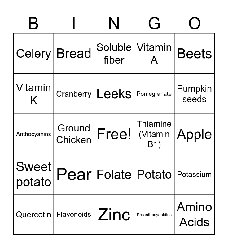 This bingo card has a free space and 24 words: Pear, Flavonoids, Leeks, Quercetin, Beets, Celery, Vitamin K, Bread, Thiamine (Vitamin B1), Folate, Pomegranate, Anthocyanins, Potato, Potassium, Cranberry, Proanthocyanidins, Apple, Soluble fiber, Pumpkin seeds, Ground Chicken, Amino Acids, Sweet potato, Vitamin A and Zinc.