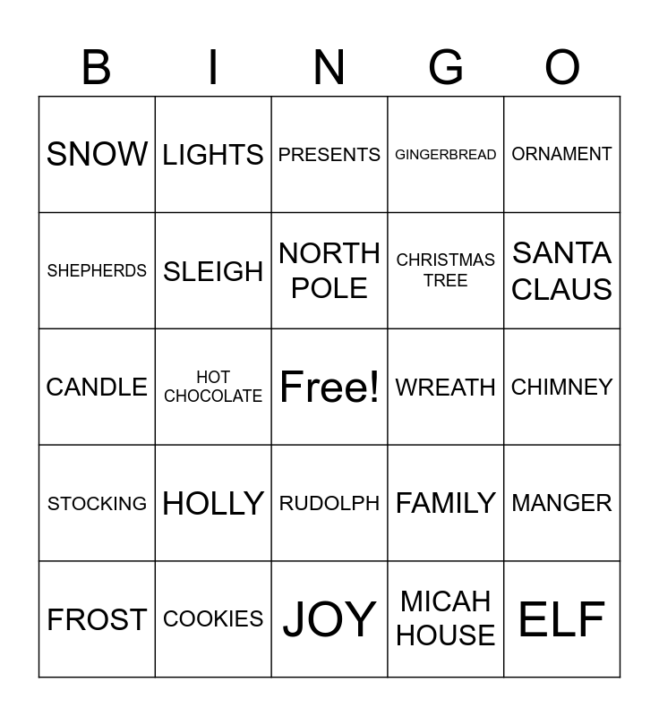 This bingo card has a free space and 25 words: HOLLY, JOY, NORTH POLE, FROST, ORNAMENT, SNOW, SHEPHERDS, LIGHTS, WREATH, RUDOLPH, CHRISTMAS TREE, CANDLE, FAMILY, MANGER, SLEIGH, ANGELS, CHIMNEY, PRESENTS, SANTA CLAUS, HOT CHOCOLATE, ELF, COOKIES, STOCKING, GINGERBREAD and MICAH HOUSE.