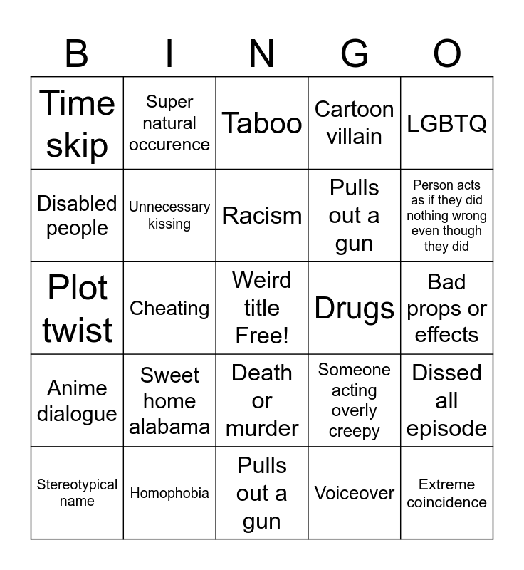 This bingo card has a free space and 24 words: Sweet home alabama, Homophobia, Racism, Stereotypical name, LGBTQ, Time skip, Disabled people, Super natural occurence, Drugs, Death or murder, Pulls out a gun, Plot twist, Someone acting overly creepy, Dissed all episode, Unnecessary kissing, Voiceover, Bad props or effects, Taboo, Person acts as if they did nothing wrong even though they did, Cheating, Extreme coincidence, Anime dialogue, Cartoon villain and Pulls out a gun.