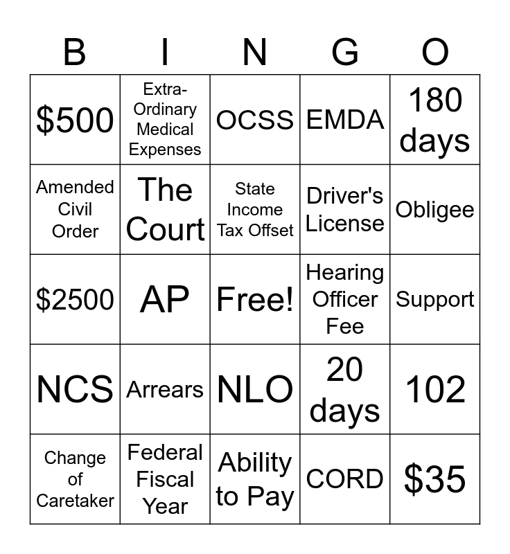 This bingo card has a free space and 25 words: Arrears, Ability to Pay, State Income Tax Offset, Change of Caretaker, 180 days, $500, Amended Civil Order, Extra-Ordinary Medical Expenses, Hearing Officer Fee, NLO, Driver's License, $2500, 20 days, 102, The Court, Legal father, Support, OCSS, Obligee, AP, $35, Federal Fiscal Year, NCS, EMDA and CORD.