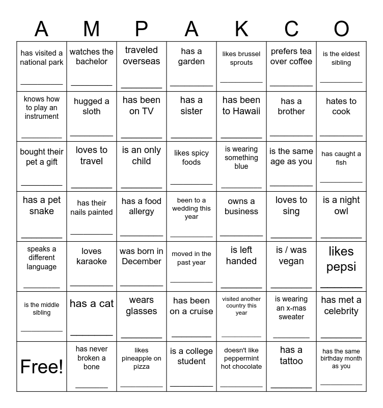 This bingo card has 49 words: is wearing an x-mas sweater _________, has a brother _________, doesn't like peppermint hot chocolate ___________, has their nails painted __________, is an only child ________, is a night owl ________, watches the bachelor _________, likes pineapple on pizza ___________, prefers tea over coffee _________, moved in the past year ___________, is the eldest sibling ___________, has a garden _________, is the same age as you _________, is wearing something blue __________, has a cat _______, loves to sing ________, knows how to play an instrument __________, hates to cook _________, has met a celebrity ________, likes brussel sprouts ___________, has been to Hawaii ________, has a food allergy _________, has visited a national park __________, hugged a sloth _________, Free!, has been on TV ________, has caught a fish ___________, has never broken a bone ________, likes spicy foods __________, loves to travel ________, has the same birthday month as you ____________, owns a business _________, is the middle sibling ____________, wears glasses ________, has a pet snake ________, is left handed ________, is / was vegan ________, likes pepsi ______, bought their pet a gift _________, was born in December _________, has been on a cruise ________, speaks a different language _________, been to a wedding this year ___________, is a college student _________, has a sister ________, traveled overseas ________, visited another country this year ____________, loves karaoke _________ and has a tattoo ________.