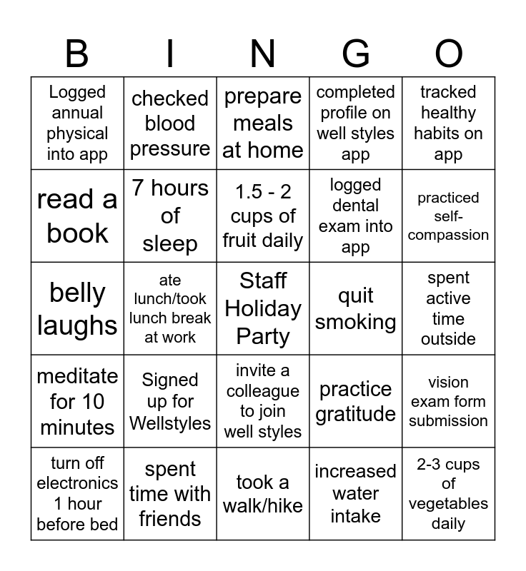 This bingo card has a free space and 24 words: Signed up for Wellstyles, spent time with friends, 1.5 - 2 cups of fruit daily, turn off electronics 1 hour before bed, tracked healthy habits on app, Logged annual physical into app, read a book, checked blood pressure, quit smoking, invite a colleague to join well styles, logged dental exam into app, belly laughs, practice gratitude, vision exam form submission, 7 hours of sleep, increased water intake, spent active time outside, prepare meals at home, practiced self-compassion, ate lunch/took lunch break at work, 2-3 cups of vegetables daily, meditate for 10 minutes, completed profile on well styles app and took a walk/hike.