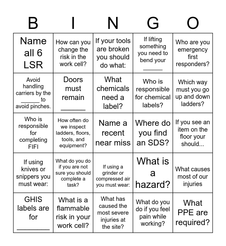 This bingo card has 25 words: What do you do if you are not sure you should complete a task?, What has caused the most severe injuries at the site?, What chemicals need a label?, GHIS labels are for ________, Who are you emergency first responders?, Name all 6 LSR, Avoid handling carriers by the ______ to avoid pinches., How can you change the risk in the work cell?, Where do you find an SDS?, If using a grinder or compressed air you must wear:, Who is responsible for chemical labels?, Who is responsible for completing FIFI, What is a hazard?, What causes most of our injuries, Doors must remain ______, What PPE are required?, If you see an item on the floor your should..., If your tools are broken you should do what:, Which way must you go up and down ladders?, How often do we inspect ladders, floors, tools, and equipment?, Name a recent near miss, What is a flammable risk in your work cell?, If using knives or snippers you must wear:, If lifting something you need to bend your ______ and What do you do if you feel pain while working?.