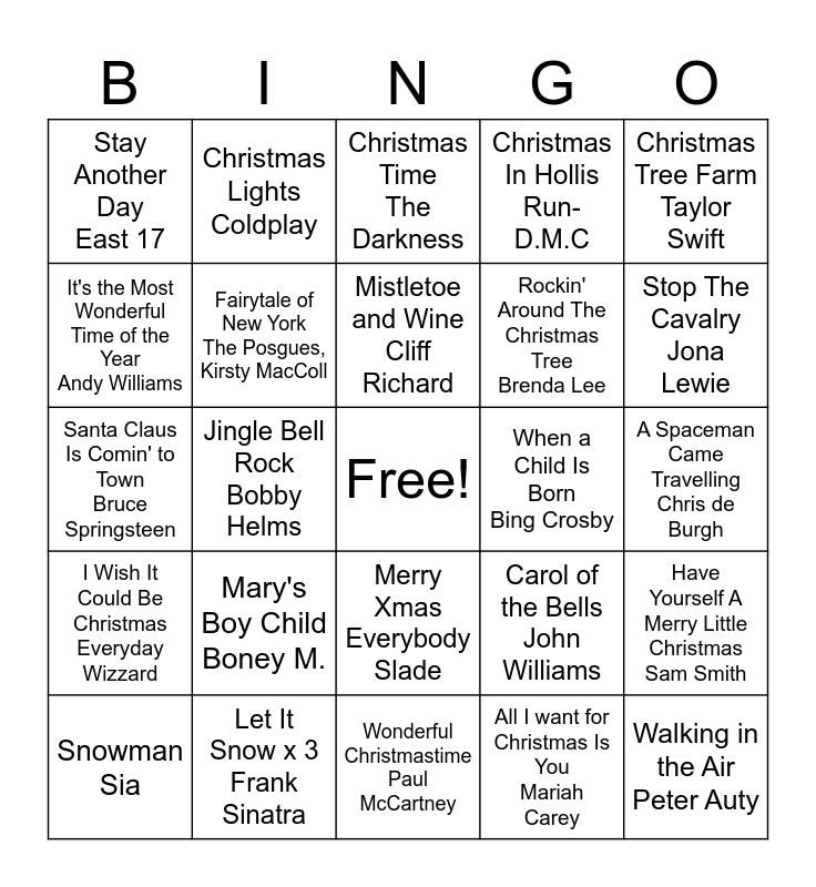 This bingo card has a free space and 34 words: Last Christmas Wham!, All I want for Christmas Is You Mariah Carey, It's Beginning to Look a Lot Like Christmas Michael Bublè, Merry Christmas Ed Sheeran, Elton John, I Wish It Could Be Christmas Everyday Wizzard, Fairytale of New York The Posgues, Kirsty MacColl, Christmas Tree Farm Taylor Swift, Snowman Sia, Christmas Lights Coldplay, Lonely This Christmas Mud, Mistletoe and Wine Cliff Richard, Christmas Time The Darkness, Christmas Without You Ava Max, Feliz Navidad José Faliciano, When a Child Is Born Bing Crosby, Stop The Cavalry Jona Lewie, Let It Snow x 3 Frank Sinatra, Santa Claus Is Comin' to Town Bruce Springsteen, Mary's Boy Child Boney M., Carol of the Bells John Williams, Merry Xmas Everybody Slade, Do They Know It's Christmas? Bandaid, Stay Another Day East 17, A Spaceman Came Travelling Chris de Burgh, Wonderful Christmastime Paul McCartney, Walking in the Air Peter Auty, Christmas In Hollis Run-D.M.C, Happy Xmas (War Is Over) John Lennon & Yoko Ono, Rockin' Around The Christmas Tree Brenda Lee, It's the Most Wonderful Time of the Year Andy Williams, Santa Tell Me Ariana Grande, Jingle Bell Rock Bobby Helms, Have Yourself A Merry Little Christmas Sam Smith and Peace on Earth/The Little Drummer Boy Bing Crosby and David Bowie.