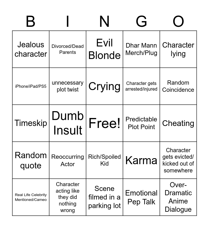 This bingo card has a free space and 29 words: Real Life Celebrity Mentioned/Cameo, Cartoony Villain, Dumb Insult, Locker Talk, Jealous character, Evil Blonde, unnecessary plot twist, Reoccurring Actor, Predictable Plot Point, Character acting like they did nothing wrong, Cheating, Over-Dramatic Anime Dialogue, Scene filmed in a parking lot, Emotional Pep Talk, Random Coincidence, Someone gets hated on for no reason, Rich/Spoiled Kid, Random quote, Character lying, Timeskip, Karma, Bad Parent/Bad Friend, Character gets arrested/injured, iPhone/iPad/PS5, Dhar Mann Merch/Plug, Divorced/Dead Parents, Character gets evicted/ kicked out of somewhere, Crying and Bad Prop/Bad Acting.