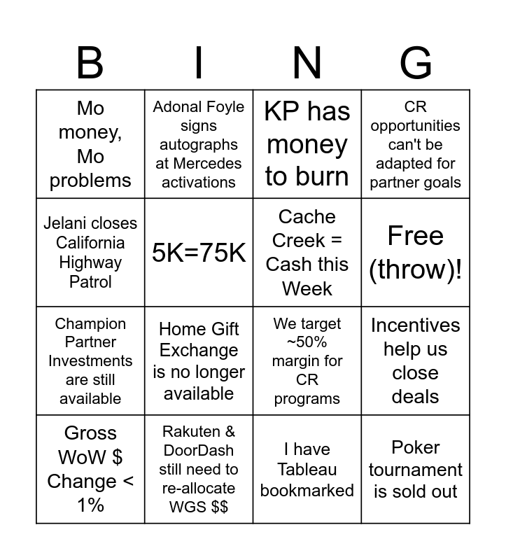 This bingo card has 17 words: I have Tableau bookmarked, Gross WoW $ Change < 1%, KP has money to burn, Mo money, Mo problems, Home Gift Exchange is no longer available, CR opportunities can't be adapted for partner goals, Incentives help us close deals, Cache Creek = Cash this Week, Free (throw)!, 5K=75K, Rakuten & DoorDash still need to re-allocate WGS $$, We target ~50% margin for CR programs, Jelani closes California Highway Patrol, Adonal Foyle signs autographs at Mercedes activations, Champion Partner Investments are still available, 163 more days until Valkyries home opener and Poker tournament is sold out.