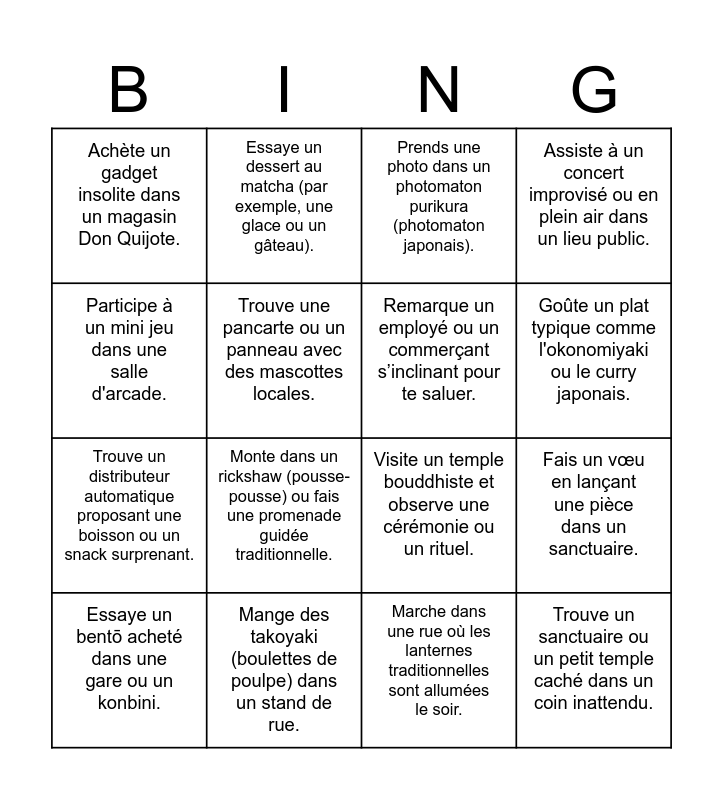 This bingo card has 16 words: Mange des takoyaki (boulettes de poulpe) dans un stand de rue., Fais un vœu en lançant une pièce dans un sanctuaire., Prends une photo dans un photomaton purikura (photomaton japonais)., Achète un gadget insolite dans un magasin Don Quijote., Trouve un distributeur automatique proposant une boisson ou un snack surprenant., Essaye un dessert au matcha (par exemple, une glace ou un gâteau)., Visite un temple bouddhiste et observe une cérémonie ou un rituel., Marche dans une rue où les lanternes traditionnelles sont allumées le soir., Participe à un mini jeu dans une salle d'arcade., Trouve une pancarte ou un panneau avec des mascottes locales., Essaye un bentō acheté dans une gare ou un konbini., Assiste à un concert improvisé ou en plein air dans un lieu public., Monte dans un rickshaw (pousse-pousse) ou fais une promenade guidée traditionnelle., Goûte un plat typique comme l'okonomiyaki ou le curry japonais., Remarque un employé ou un commerçant s’inclinant pour te saluer. and Trouve un sanctuaire ou un petit temple caché dans un coin inattendu..