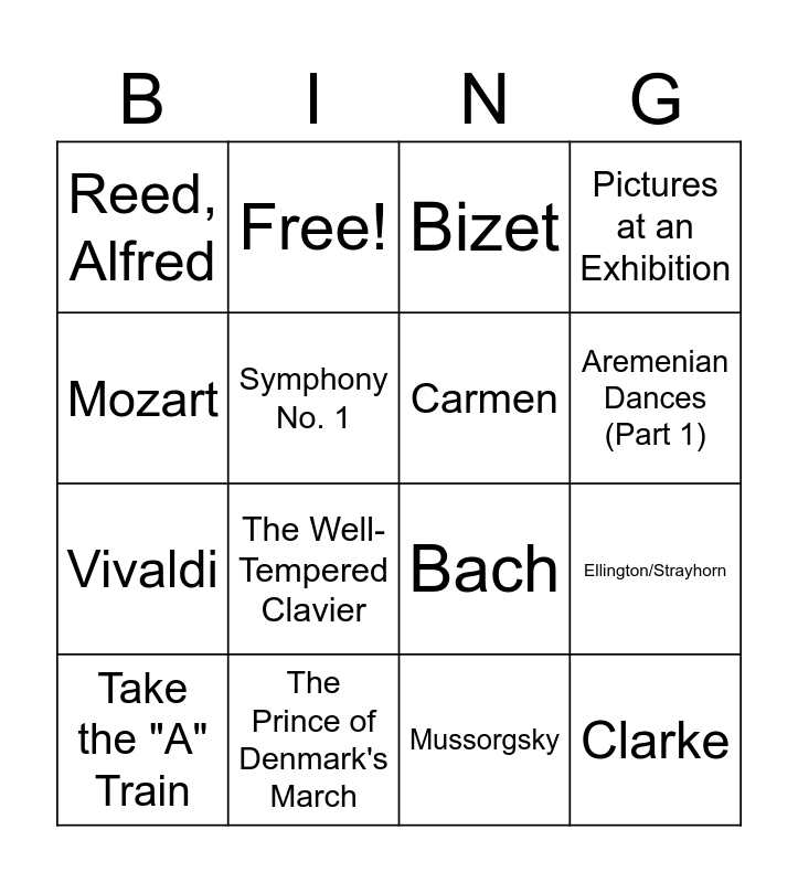This bingo card has 19 words: Bach, Beethoven, Bizet, Clarke, Ellington/Strayhorn, Mozart, Mussorgsky, Reed, Alfred, Free!, Vivaldi, The Well-Tempered Clavier, Symphony No. 1, Carmen, The Prince of Denmark's March, Take the "A" Train, The Magic Flute, Pictures at an Exhibition, Aremenian Dances (Part 1) and The Four Seasons.