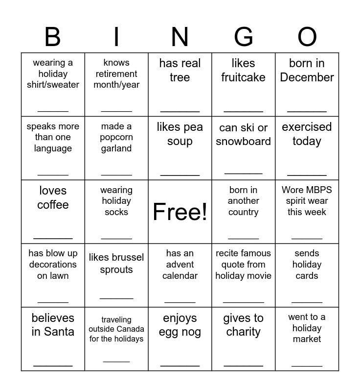 This bingo card has a free space and 24 words: likes brussel sprouts ______, traveling outside Canada for the holidays ______, likes pea soup ______, believes in Santa ______, born in December ______, wearing a holiday shirt/sweater ______, speaks more than one language ______, knows retirement month/year ______, born in another country ______, has an advent calendar ______, can ski or snowboard ______, loves coffee ______, recite famous quote from holiday movie ________, sends holiday cards ______, made a popcorn garland ______, gives to charity ______, Wore MBPS spirit wear this week ______, has real tree ______, exercised today ______, wearing holiday socks ______, went to a holiday market ______, has blow up decorations on lawn ______, likes fruitcake ______ and enjoys egg nog ______.
