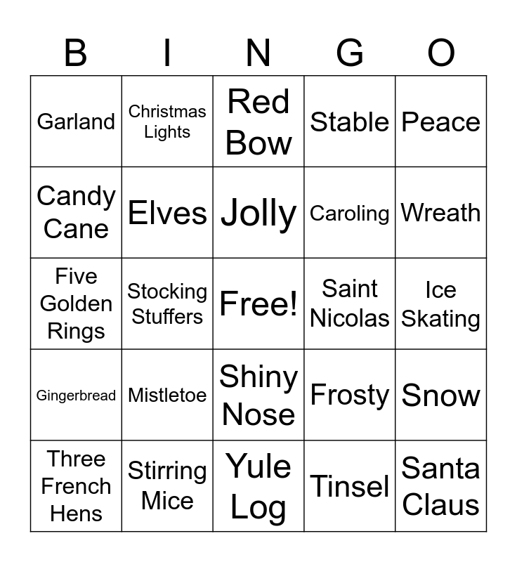 This bingo card has a free space and 52 words: Christmas Tree, Santa Claus, Gifts, Yule Log, Mistletoe, Ornaments, Christmas Lights, Holly, Candy Cane, Presents, Elves, Sleigh, Snow, Frosty, Grinch, Rudolph, Jolly, Saint Nicolas, Joy, Peace, Stocking Stuffers, Tinsel, Garland, Caroling, Noel, 12 Days of Christmas, Shopping, Christmas Music, Wreath, Angel Tree, Nativity, Stable, Star, Bah Humbug, Poinsettias, Red Bow, Stirring Mice, Snowflakes, Magic Hat, Snowman, Hot Cocoa, Ice Skating, Gingerbread, Corn Cob Pipe, Shiny Nose, Button Nose, Coal, Five Golden Rings, Partridge in a Pair Tree, 4 Calling Birds, Three French Hens and Two Turtle Doves.