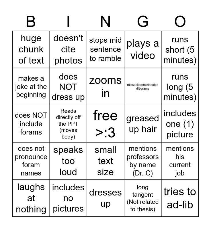 This bingo card has a free space and 29 words: laughs at nothing, Uses unprofessional slang, Reads directly off the PPT (moves body), does not include a work cited page, huge chunk of text, stops mid sentence to ramble, does NOT dress up, speaks too loud, greased up hair, includes no pictures, includes one (1) picture, tries to ad-lib, dresses up, long tangent (Not related to thesis), runs long (5 minutes), no eye contact (stares at slides), small text size, does not pronounce foram names, runs short (5 minutes), does NOT include forams, mentions professors by name (Dr. C), other unprofessional nicknames, misspelled/mislabeled diagrams, makes a joke at the beginning, plays a video, doesn't cite photos, mentions his current job, zooms in and actually showed up.