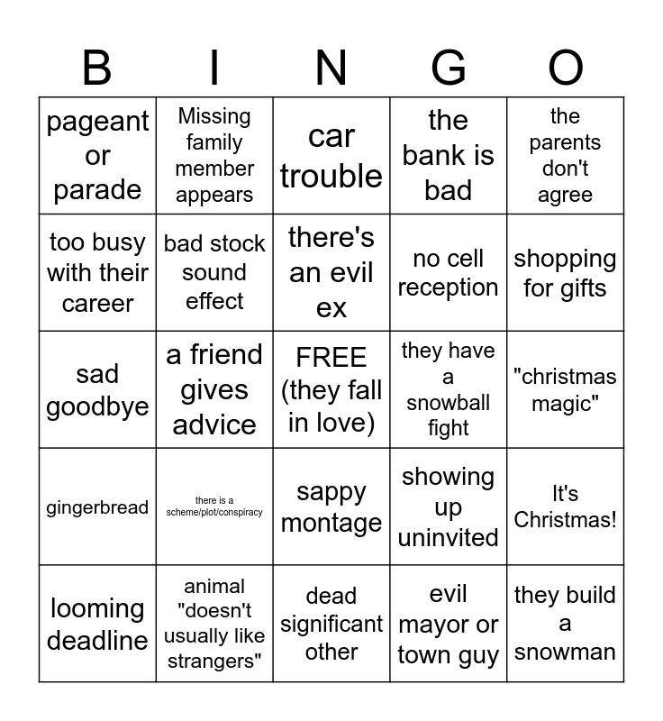 This bingo card has a free space and 73 words: secret christmas recipe, POC < 3, pageant or parade, carriage/sleigh ride, family photo, christmas card, gingerbread, new bf threatened, showing up uninvited, mistletoe, falling down while decorating, bad at gendered activity, bad stock sound effect, "christmas magic", Bad Santa, Missing family member appears, dead significant other, too busy with their career, small town person loves christmas, they have a snowball fight, there's an evil ex, the bank is bad, the parents don't agree, there's a young child involved, looming deadline, characters collide, tragic past, dead/dying parents, christmas cookies involved, gotta make the big sale, animal "doesn't usually like strangers", specific gift foreshadowed, holiday makeover or wardrobe change, single parent, a friend gives advice, flashback to the past, secret parentage/family ties, they go get a christmas tree, they build a snowman, someone mentions non-christmas holidays (e.g. hanukkah kwanzaa ramadan), evil mayor or town guy, there is a scheme/plot/conspiracy, revive failing small-town business, christmas party, matchmaker best friend, no cell reception, car trouble, singing carols, awkward meeting, sad goodbye, old schoolmate, santa in disguise, ugly sweater, interrupted kiss, learns to believe, egg nog!, cheesy music, sappy montage, welcome to [town] sign, characters dislike each other, ice skating, snowstorm delay, friendly/unfriendly plow truck driver, shopping for gifts, hospital, special ornament, dream sequence, Chase To/Through The Airport, It's Christmas!, Good Mayor or Town Guy, Christmas Day Breakup, "Back in the City" and tradition you've never heard of.