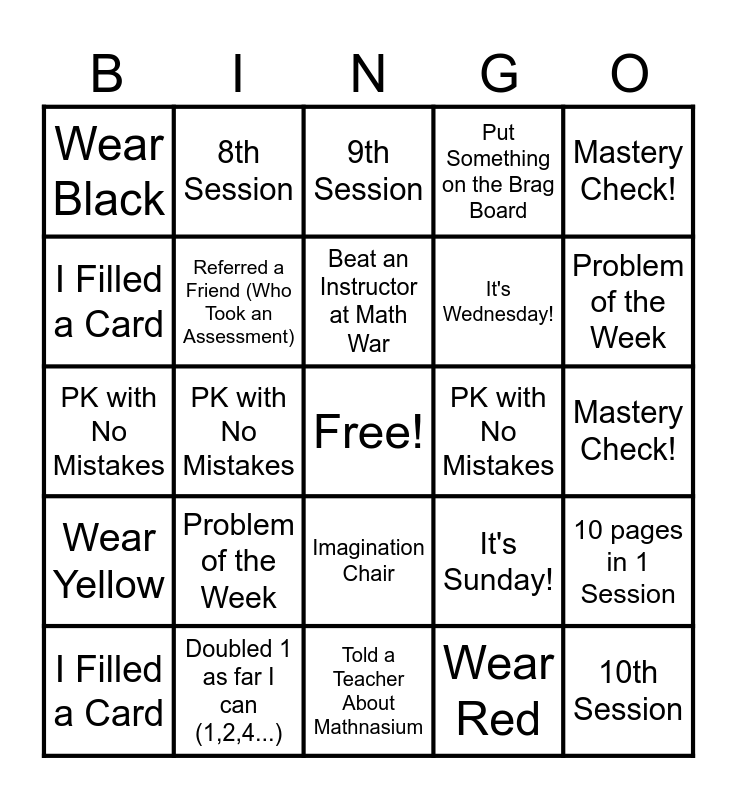 This bingo card has a free space and 24 words: Problem of the Week, Doubled 1 as far I can (1,2,4...), Beat an Instructor at Math War, I Filled a Card, Mastery Check!, Wear Black, I Filled a Card, 8th Session, PK with No Mistakes, Imagination Chair, It's Wednesday!, PK with No Mistakes, It's Sunday!, 10 pages in 1 Session, Referred a Friend (Who Took an Assessment), Wear Red, Mastery Check!, 9th Session, Problem of the Week, PK with No Mistakes, 10th Session, Wear Yellow, Put Something on the Brag Board and Told a Teacher About Mathnasium.