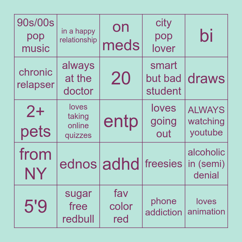 This bingo card has 25 words: ednos, fav color red, 20, 5'9, bi, 90s/00s pop music, chronic relapser, in a happy relationship, loves going out, adhd, smart but bad student, 2+ pets, freesies, alcoholic in (semi) denial, always at the doctor, loves animation, ALWAYS watching youtube, on meds, draws, loves taking online quizzes, entp, sugar free redbull, from NY, city pop lover and phone addiction.