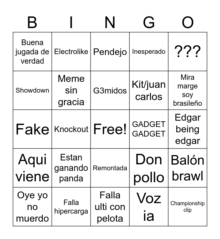 This bingo card has a free space and 24 words: Oye yo no muerdo, Estan ganando panda, G3midos, Voz ia, ???, Buena jugada de verdad, Electrolike, Pendejo, GADGET GADGET, Edgar being edgar, Fake, Meme sin gracia, Don pollo, Balón brawl, Showdown, Falla hipercarga, Falla ulti con pelota, Inesperado, Mira marge soy brasileño, Aqui viene, Knockout, Remontada, Kit/juan carlos and Championship clip.