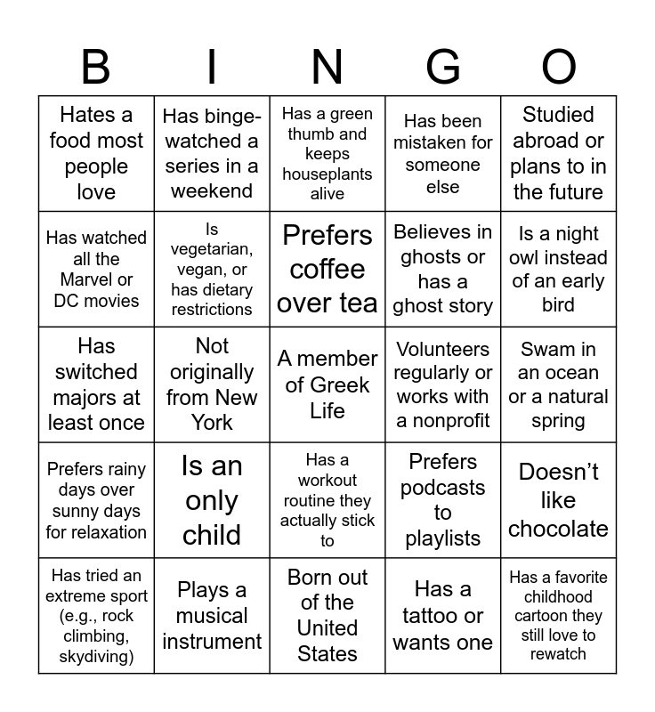 This bingo card has a free space and 24 words: Is an only child, Plays a musical instrument, Prefers coffee over tea, Has tried an extreme sport (e.g., rock climbing, skydiving), Studied abroad or plans to in the future, Hates a food most people love, Has watched all the Marvel or DC movies, Has binge-watched a series in a weekend, Volunteers regularly or works with a nonprofit, Has a workout routine they actually stick to, Believes in ghosts or has a ghost story, Has switched majors at least once, Prefers podcasts to playlists, Doesn’t like chocolate, Is vegetarian, vegan, or has dietary restrictions, Has a tattoo or wants one, Swam in an ocean or a natural spring, Has a green thumb and keeps houseplants alive, Is a night owl instead of an early bird, Not originally from New York, Has a favorite childhood cartoon they still love to rewatch, Prefers rainy days over sunny days for relaxation, Has been mistaken for someone else and Born out of the United States.
