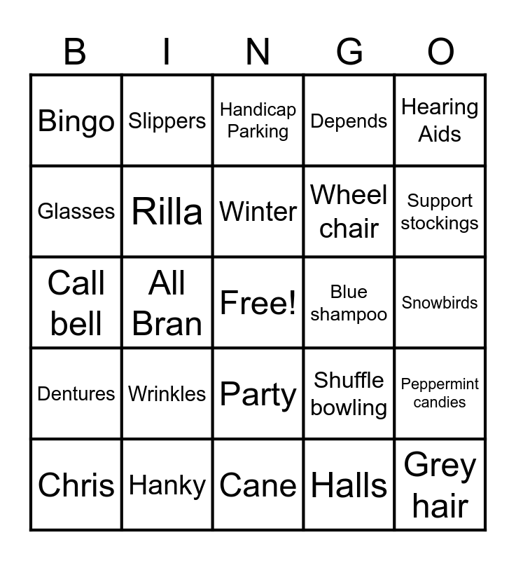 This bingo card has a free space and 39 words: Birthday, 60th, Cake, Rilla, Chris, Party, Winter, Walker, Hearing Aids, Dentures, All Bran, Depends, Grey hair, Snowbirds, Blue shampoo, Wrinkles, Senior discounts, Bingo, Balloon badminton, Shuffle bowling, Glasses, Cane, Wheel chair, Support stockings, Thin hair, Poor vision, Can't drive, Pills, Cough, Slippers, Velcro shoes, Slip, Handicap Parking, Hanky, Halls, Werthers, Peppermint candies, Call bell and Home care.