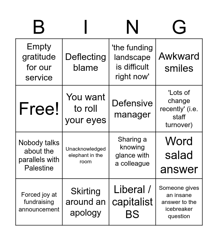 This bingo card has 16 words: Skirting around an apology, Word salad answer, 'the funding landscape is difficult right now', Empty gratitude for our service, Nobody talks about the parallels with Palestine, Deflecting blame, Sharing a knowing glance with a colleague, Liberal / capitalist BS, Free!, You want to roll your eyes, Forced joy at fundraising announcement, Awkward smiles, Unacknowledged elephant in the room, 'Lots of change recently' (i.e. staff turnover), Defensive manager and Someone gives an insane answer to the icebreaker question.