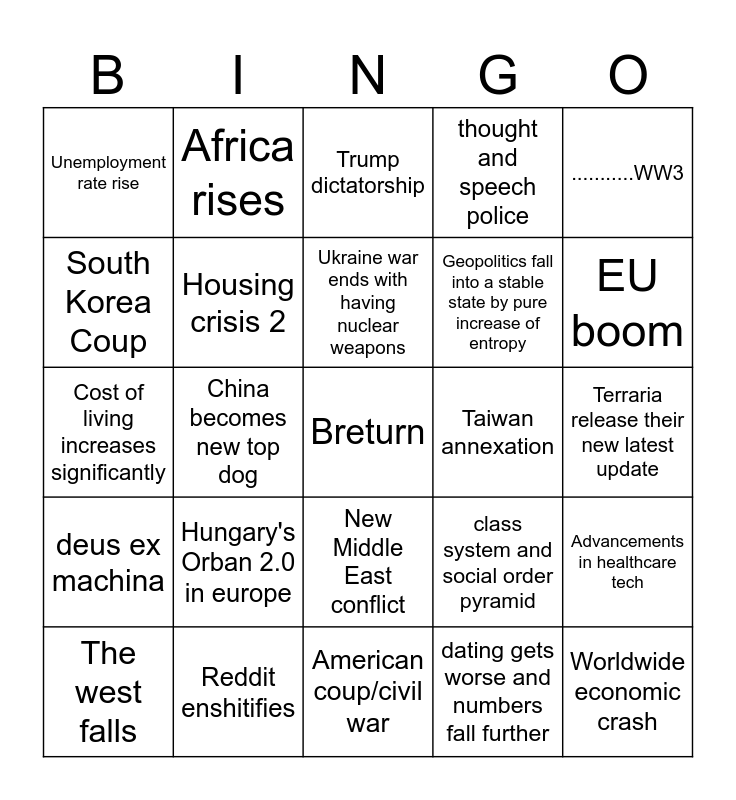 This bingo card has a free space and 24 words: Hungary's Orban 2.0 in europe, Reddit enshitifies, Ukraine war ends with having nuclear weapons, The west falls, ...........WW3, Unemployment rate rise, South Korea Coup, Africa rises, Taiwan annexation, New Middle East conflict, Geopolitics fall into a stable state by pure increase of entropy, Cost of living increases significantly, class system and social order pyramid, Advancements in healthcare tech, Housing crisis 2, dating gets worse and numbers fall further, Terraria release their new latest update, Trump dictatorship, EU boom, China becomes new top dog, Worldwide economic crash, deus ex machina, thought and speech police and American coup/civil war.