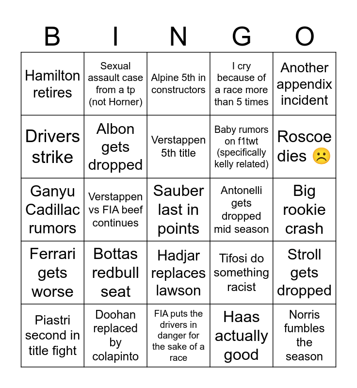 This bingo card has a free space and 24 words: Bottas redbull seat, Doohan replaced by colapinto, Verstappen 5th title, Piastri second in title fight, Another appendix incident, Hamilton retires, Drivers strike, Sexual assault case from a tp (not Horner), Antonelli gets dropped mid season, Hadjar replaces lawson, Baby rumors on f1twt (specifically kelly related), Ganyu Cadillac rumors, Tifosi do something racist, Stroll gets dropped, Albon gets dropped, Haas actually good, Big rookie crash, Alpine 5th in constructors, Roscoe dies ☹️, Verstappen vs FIA beef continues, Norris fumbles the season, Ferrari gets worse, I cry because of a race more than 5 times and FIA puts the drivers in danger for the sake of a race.