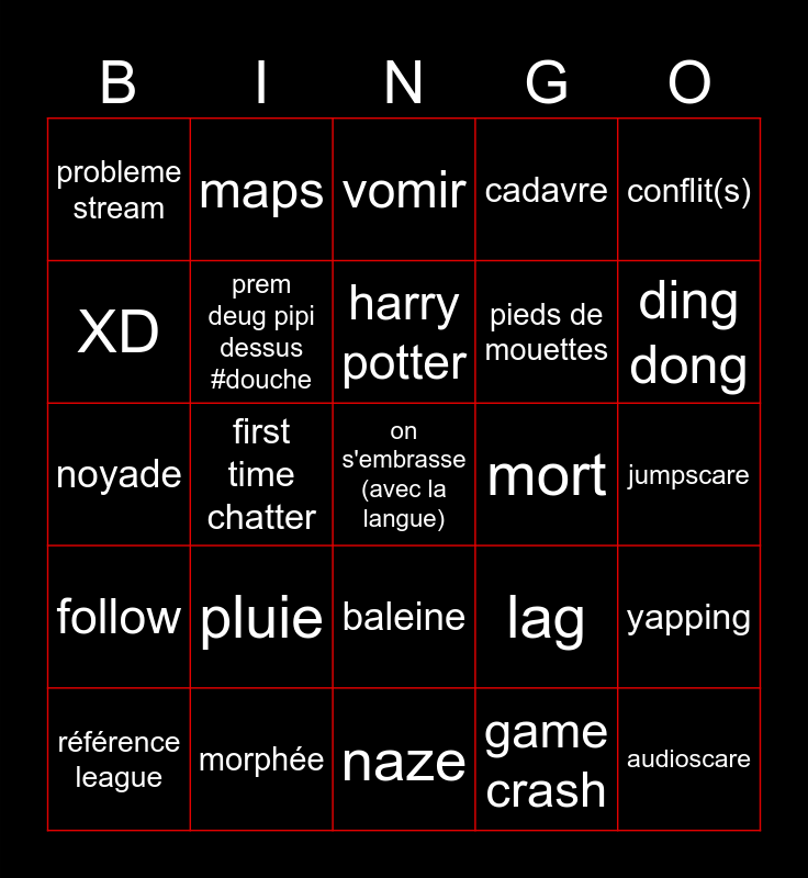 This bingo card has a free space and 24 words: pluie, morphée, harry potter, référence league, conflit(s), probleme stream, XD, maps, mort, baleine, pieds de mouettes, noyade, lag, yapping, prem deug pipi dessus #douche, game crash, jumpscare, vomir, ding dong, first time chatter, audioscare, follow, cadavre and naze.