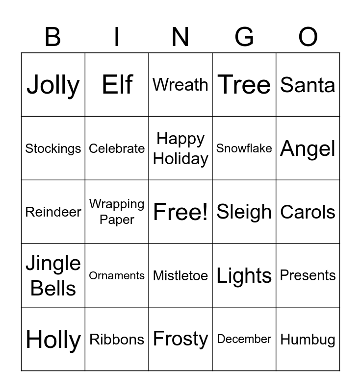 This bingo card has a free space and 24 words: Ornaments, Ribbons, Happy Holiday, Holly, Santa, Jolly, Stockings, Elf, Sleigh, Mistletoe, Snowflake, Reindeer, Lights, Presents, Celebrate, December, Carols, Wreath, Angel, Wrapping Paper, Humbug, Jingle Bells, Tree and Frosty.
