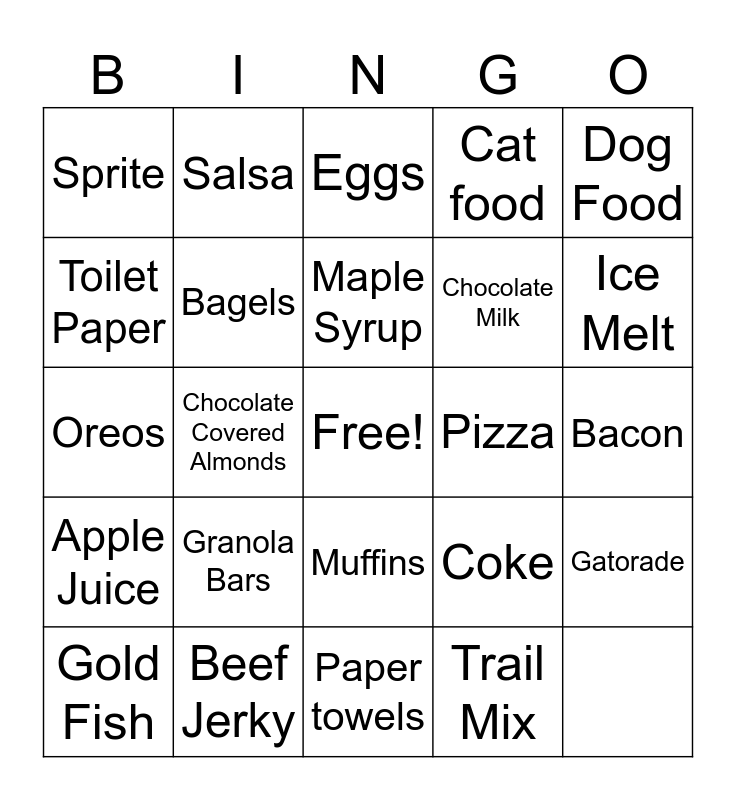 This bingo card has a free space and 24 words: Apple Juice, Beef Jerky, Muffins, Coke, Dog Food, Sprite, Salsa, Eggs, Chocolate Milk, Gatorade, Toilet Paper, Bagels, Rotisserie Chicken, Pizza, Ice Melt, Gold Fish, Chocolate Covered Almonds, Maple Syrup, Cat food, Bacon, Oreos, Granola Bars, Paper towels and Trail Mix.